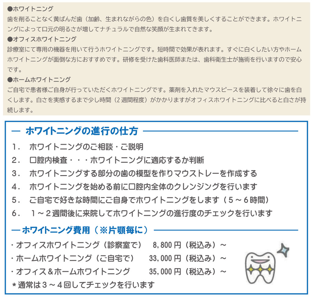 ![]() ホワイトニング(オフィス・ホーム)、審美歯科、ノンクラスプデンチャー(バネのない義歯)なども行っております。 ![]() |